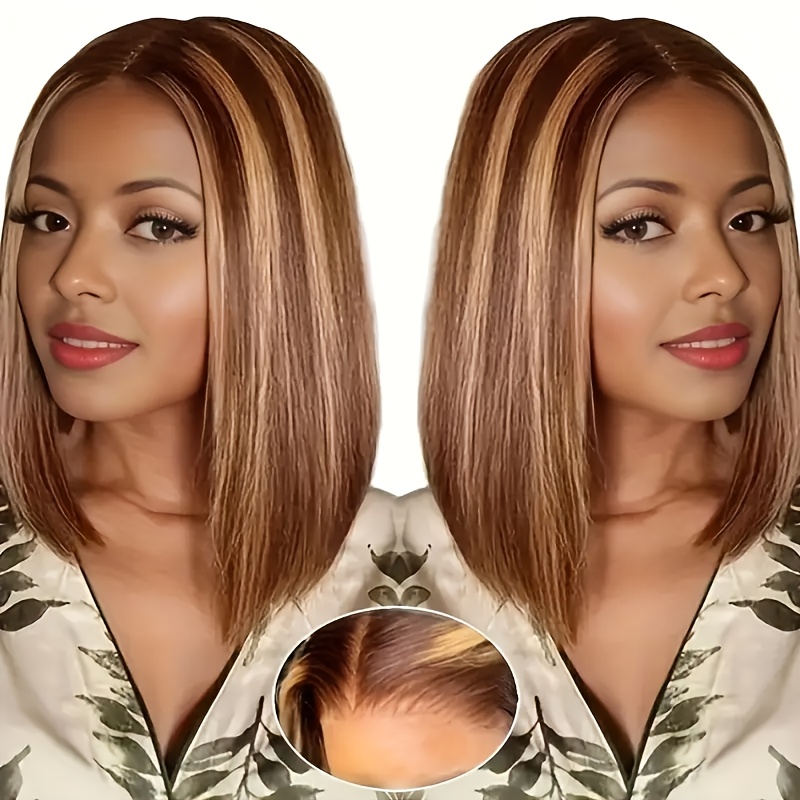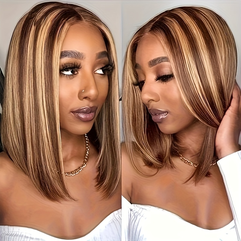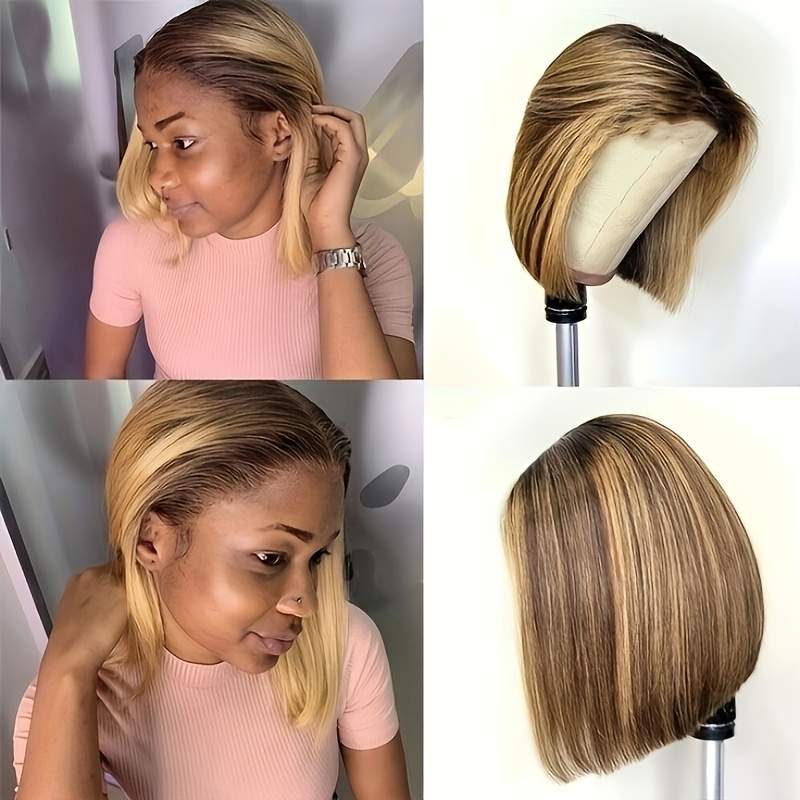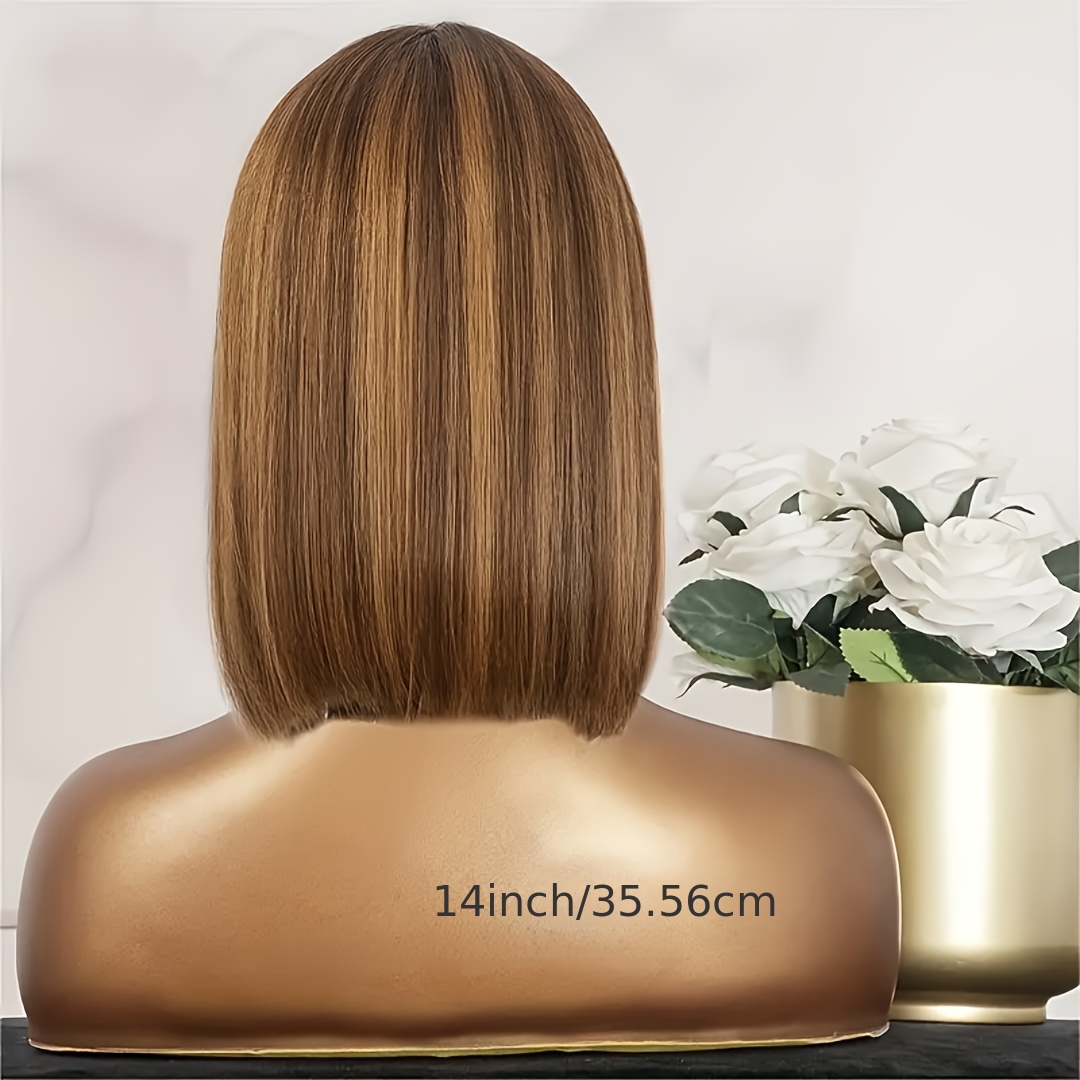 14 Inch Brown Ombre Honey Blonde Bob Wig - Short Straight Synthetic Hair Wigs fo