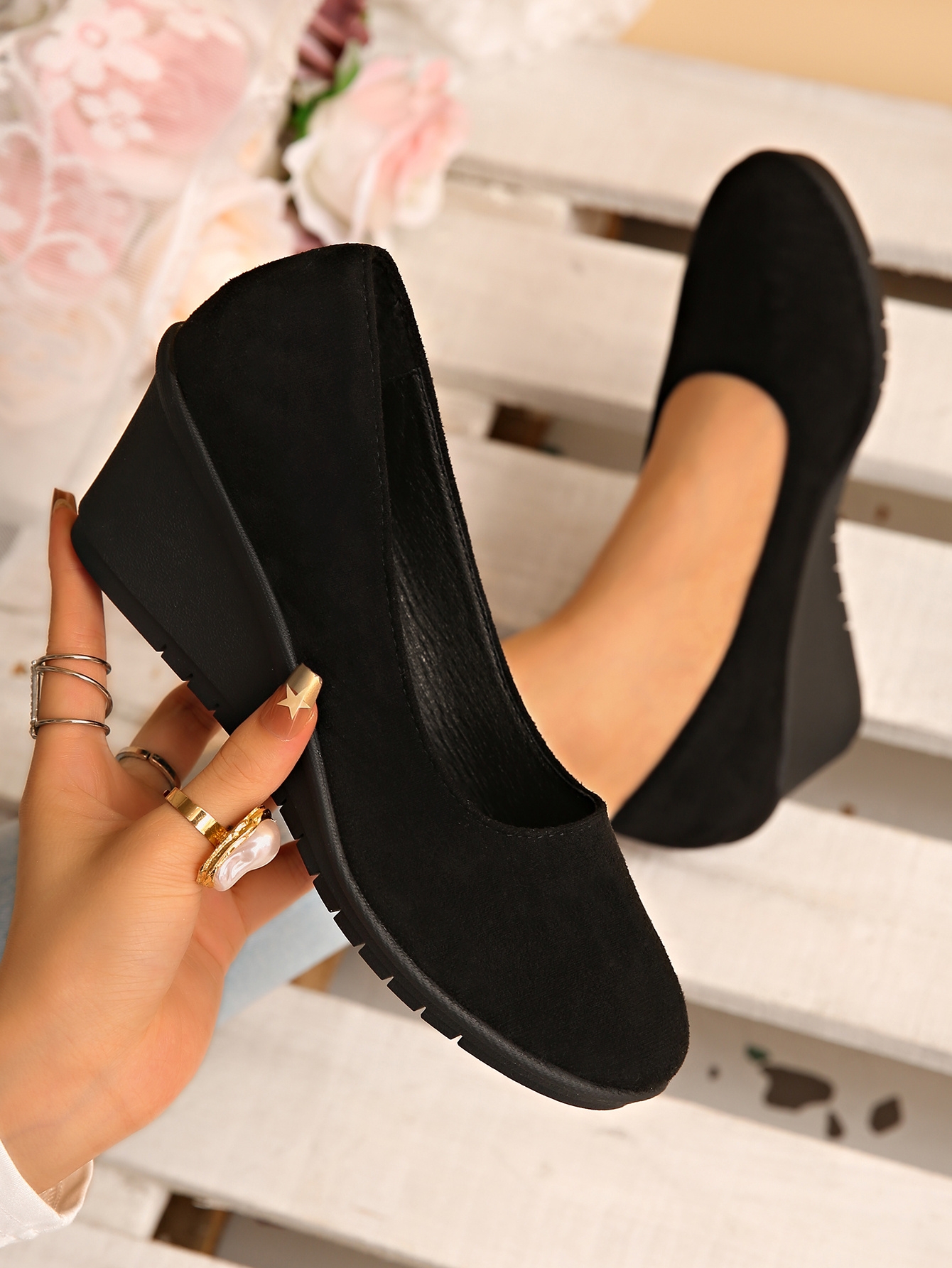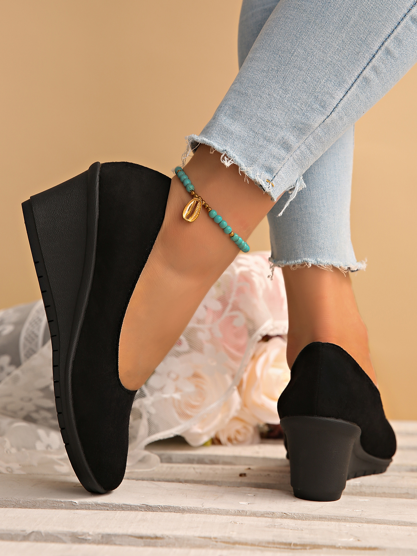 · Features a thick-soled platform heel that provides a stable base with a high heel lift.