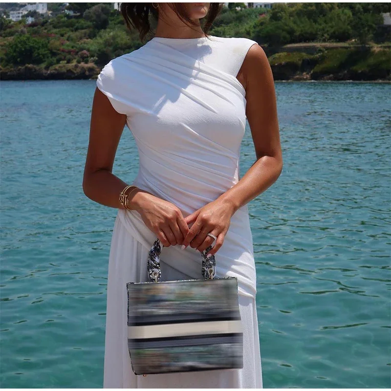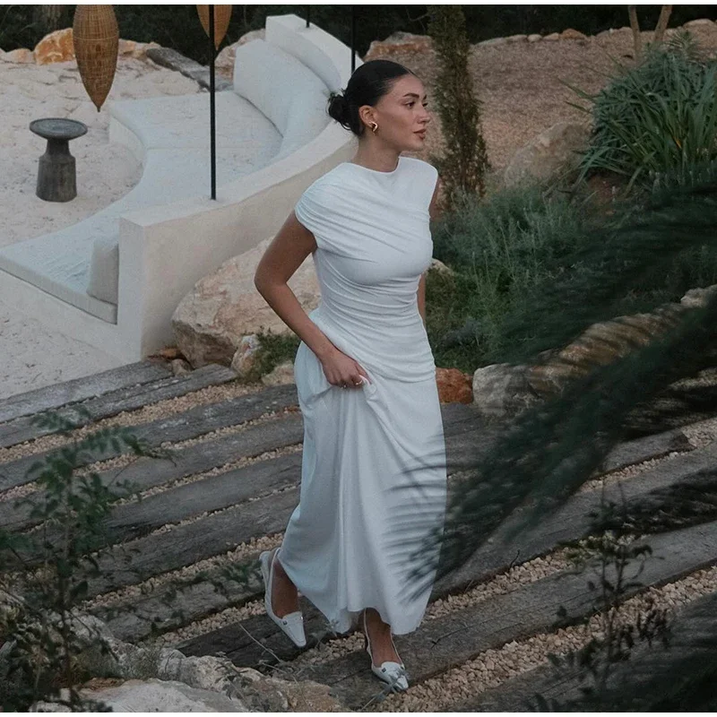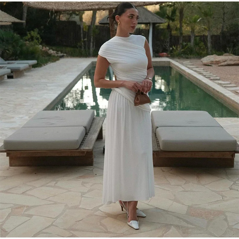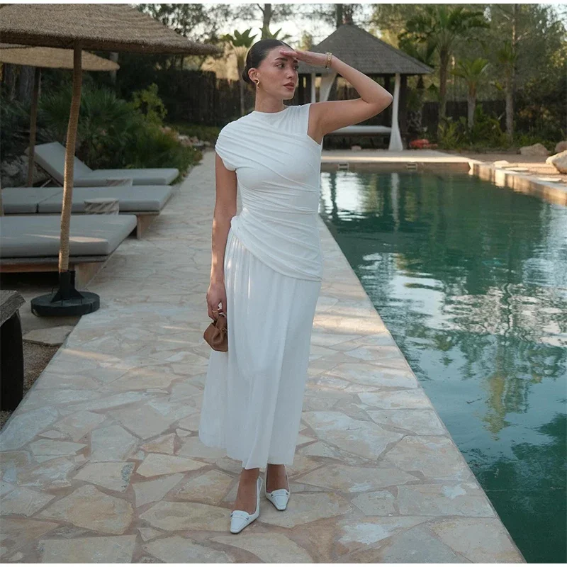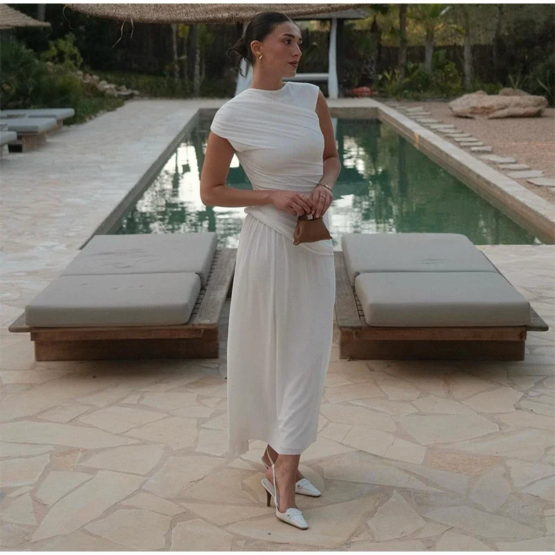 Fashion O Neck Sleeveless Bodycon Dresses Women Elegant White Pleated Irregular