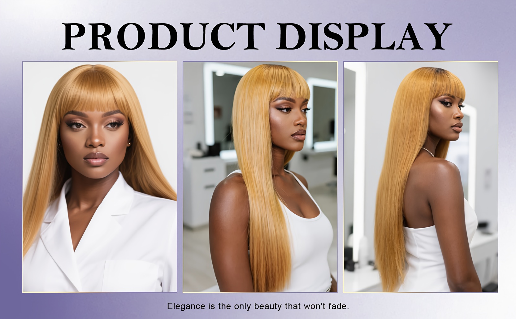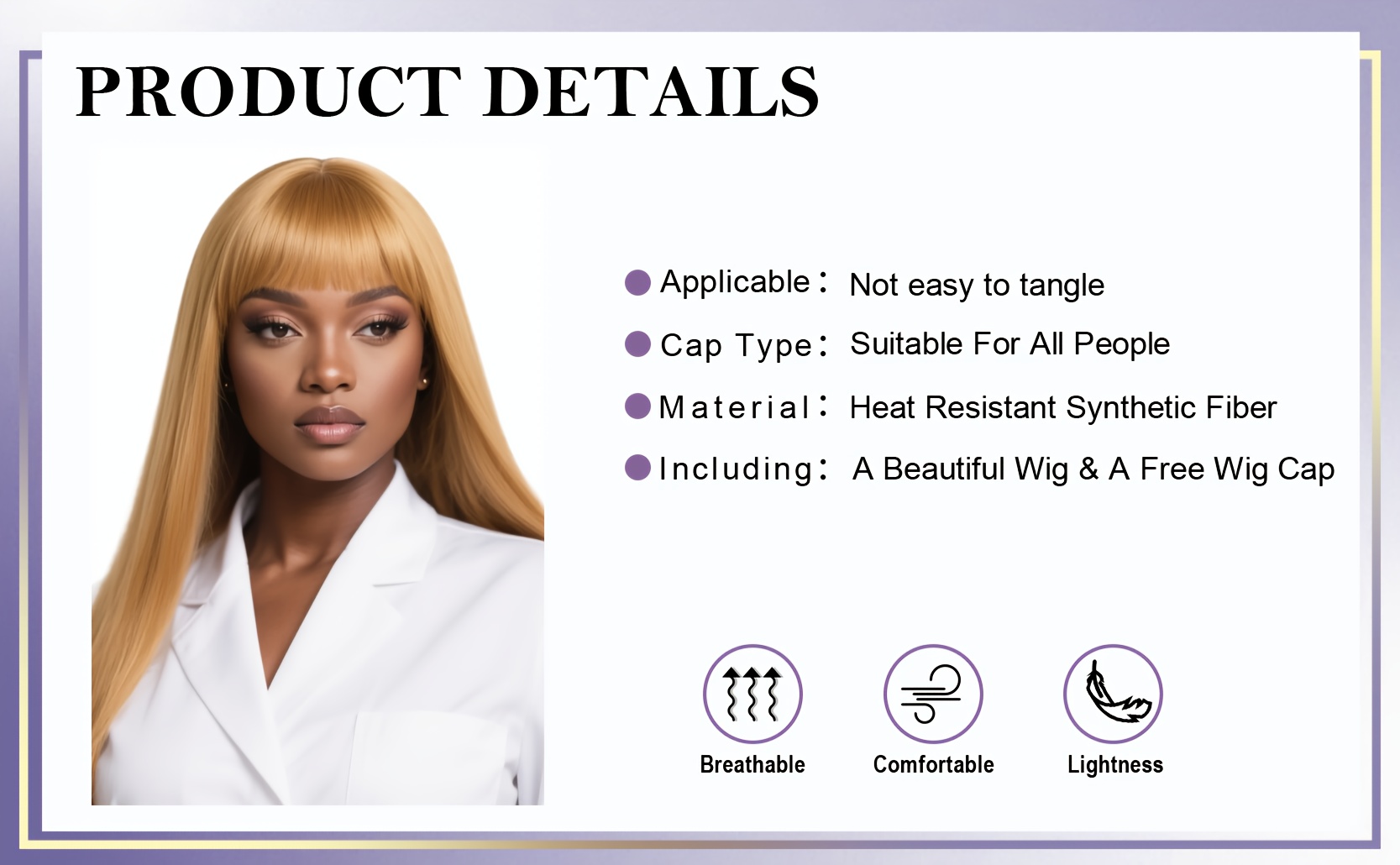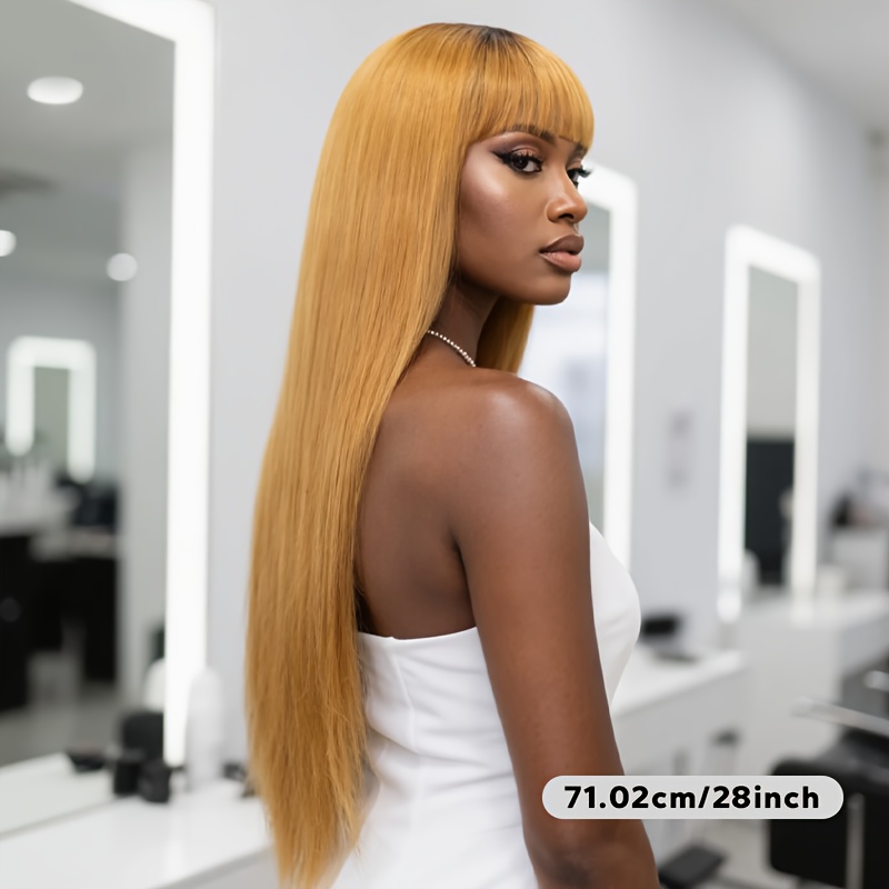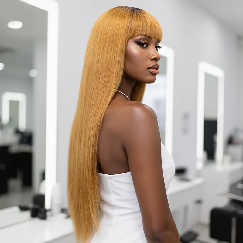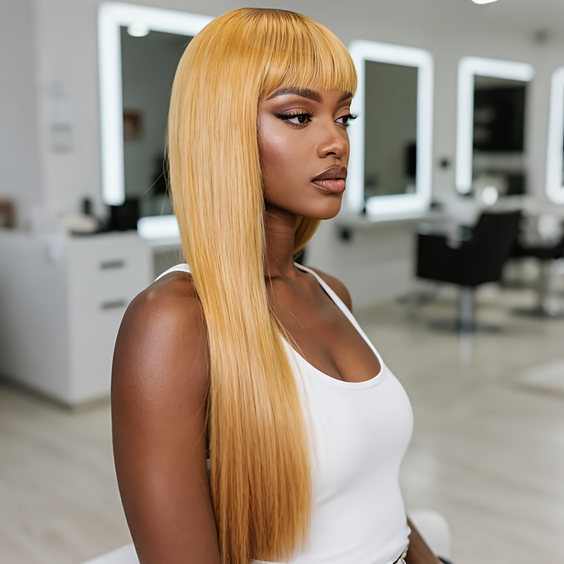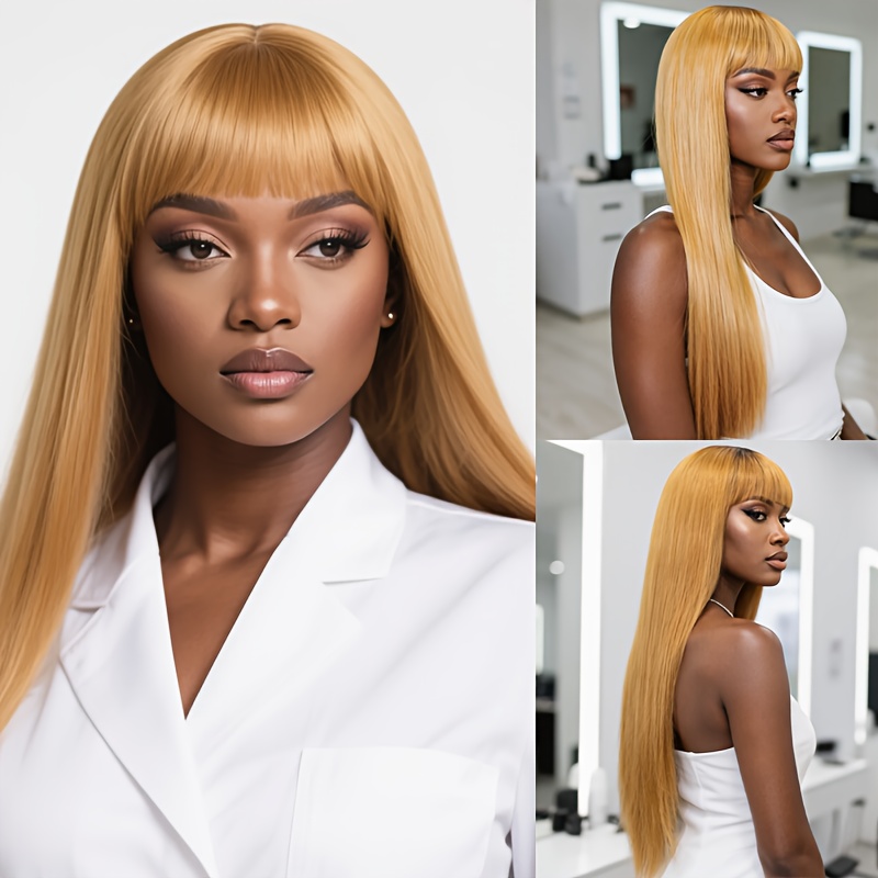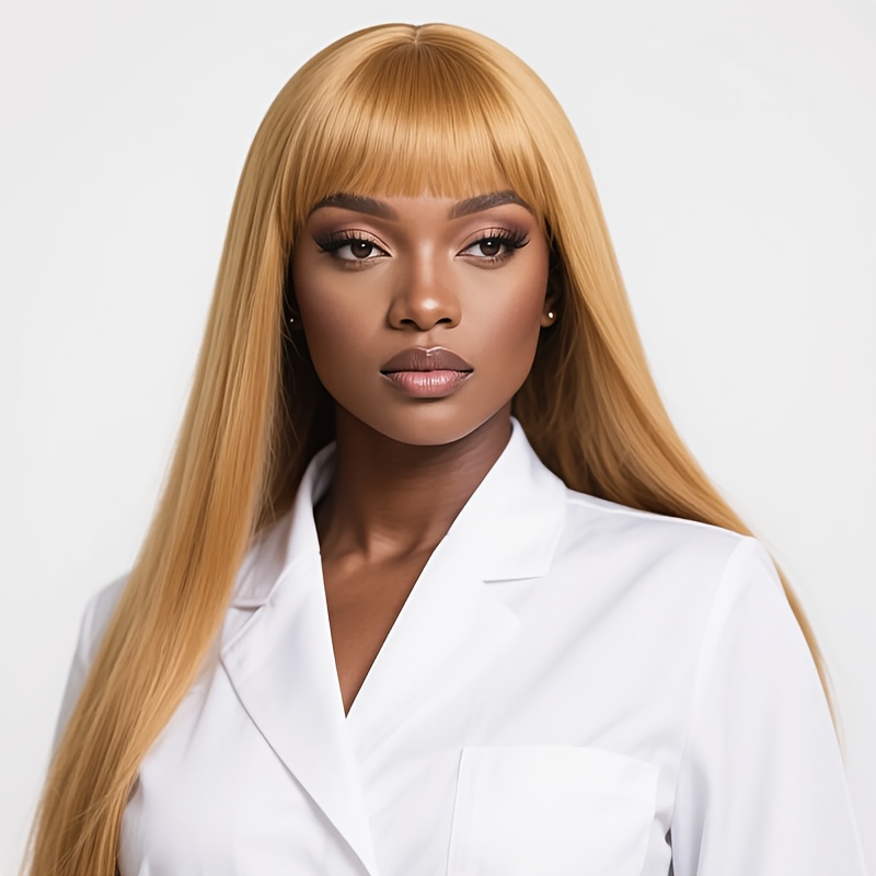 Honey-Golden Blonde Straight Hair Wig with Blunt Bangs - Heat-Resistant -Looking