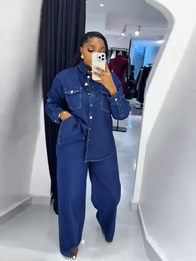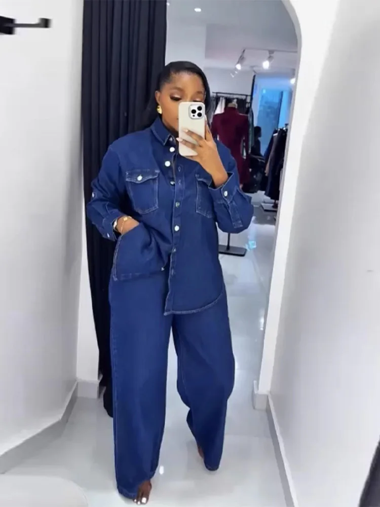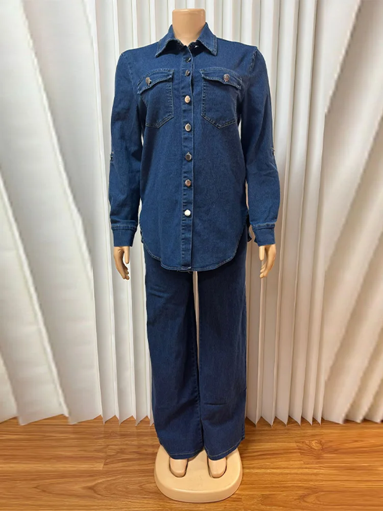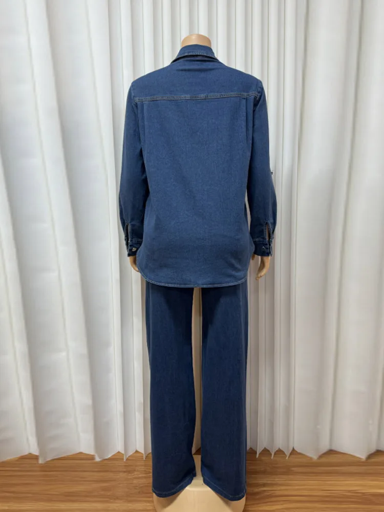 Women's Denim Trouser Suits Turn-down Collar Single Breasted Coat Empire Straigh
